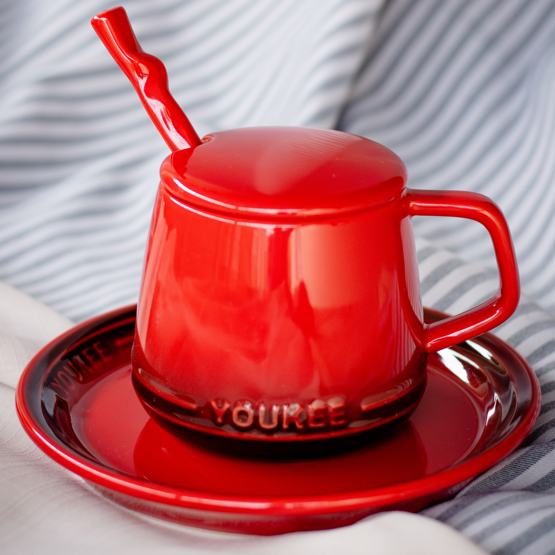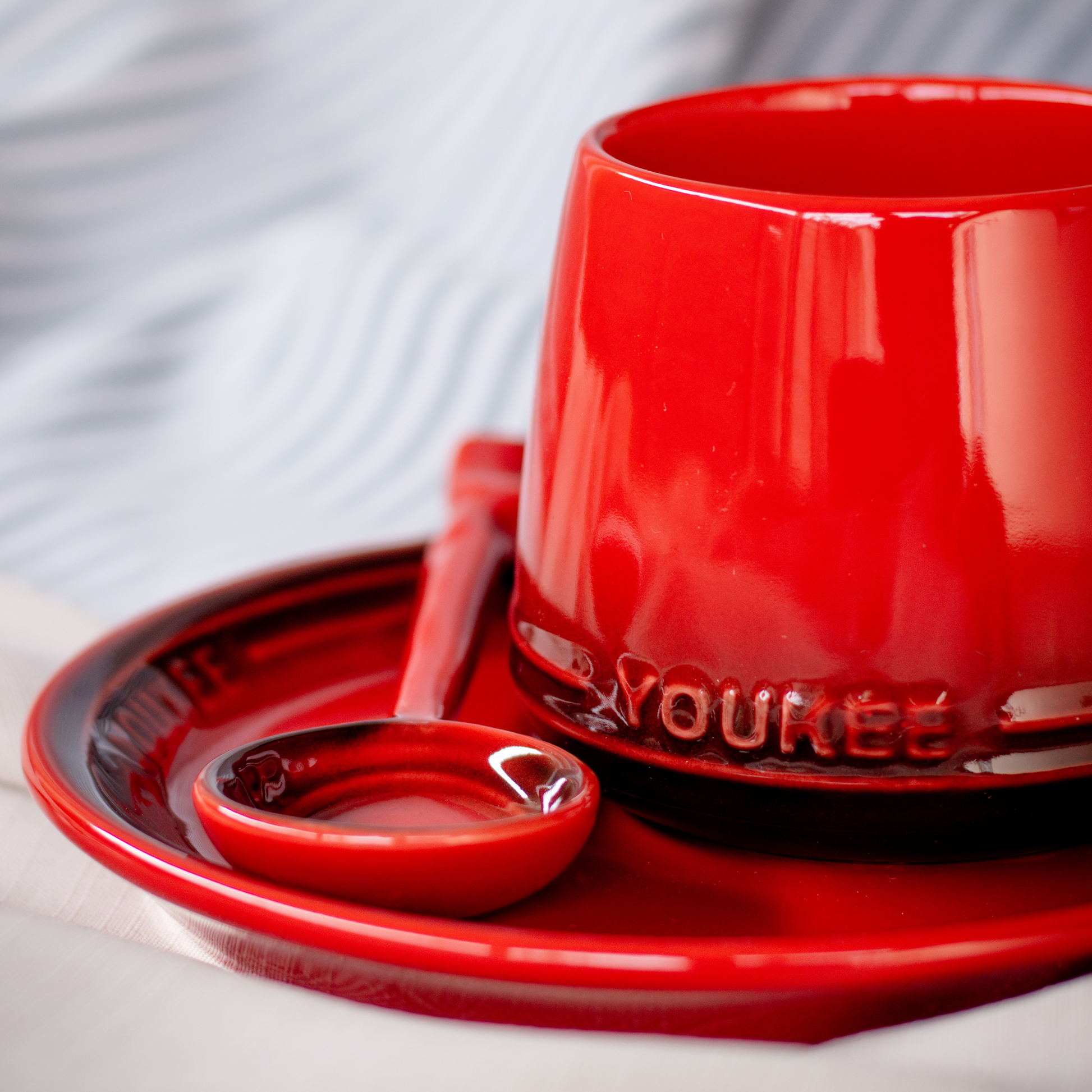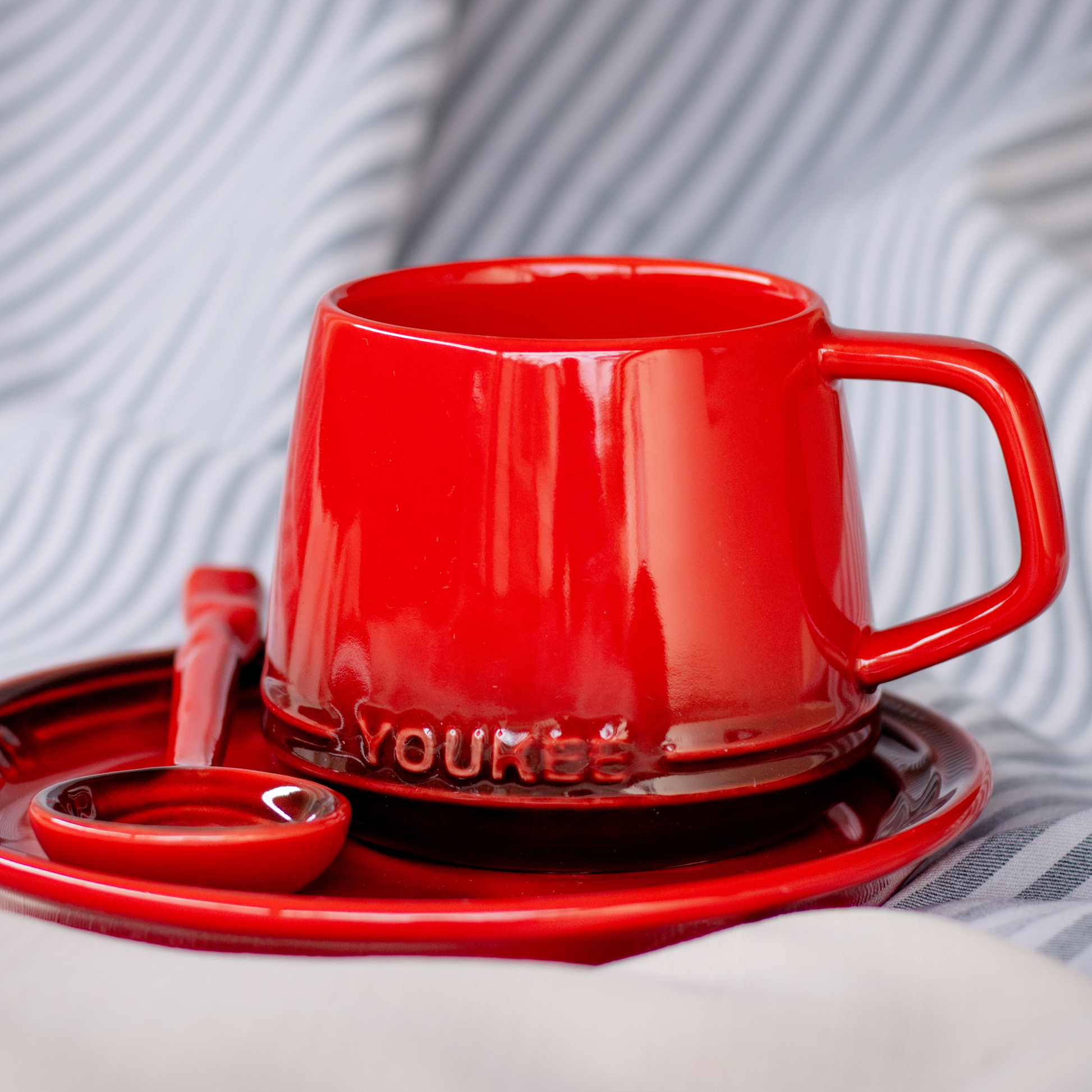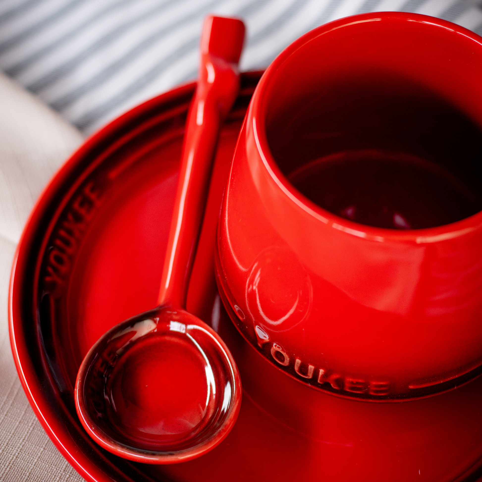 Made from premium-quality stoneware, this mug offers the perfect 350ml capacity for enjoying your favourite hot beverages, whether it's your morning coffee or a soothing cup of tea. This set comes complete with a matching spoon, lid, and saucer, making it not only practical but also stylish.